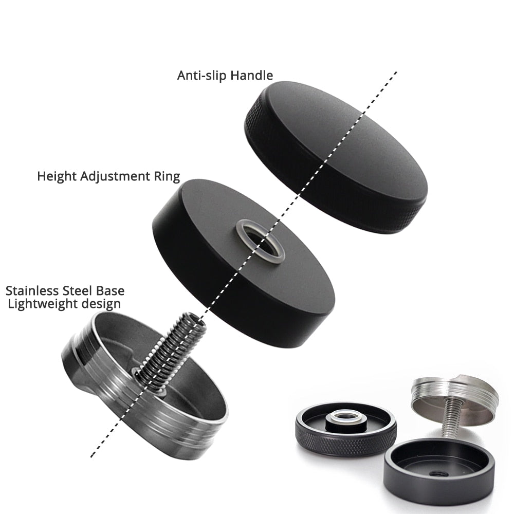 The height is easily adjustable by it's screw mechanism (no grub screws ,shims, or Allen keys required) to suit different doses or baskets, you can set desired tamping depth for consistent tamping pressure every time.