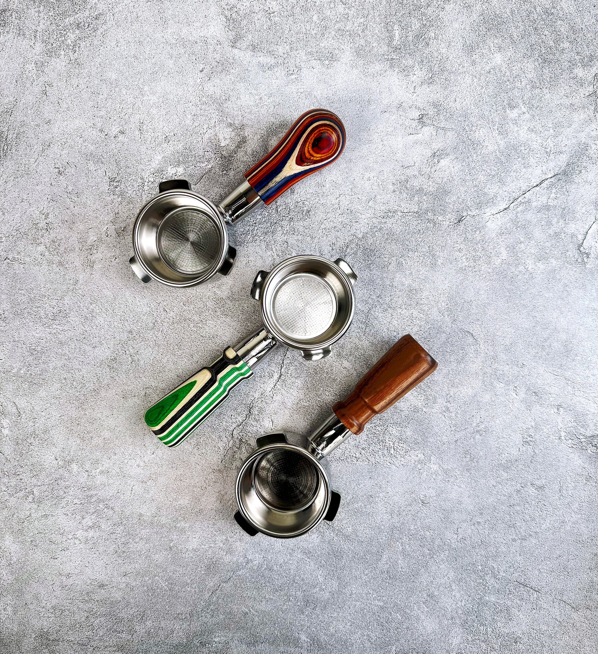 This 54mm bottomless portafilter features a short handle crafted from vacuum-dyed timber in a striking red hue. The vacuum dyeing process ensures the dye penetrates deep into the wood fibers, creating a more consistent and long-lasting color compared to traditional staining methods. This process is also environmentally friendly, as it uses less water and dye.