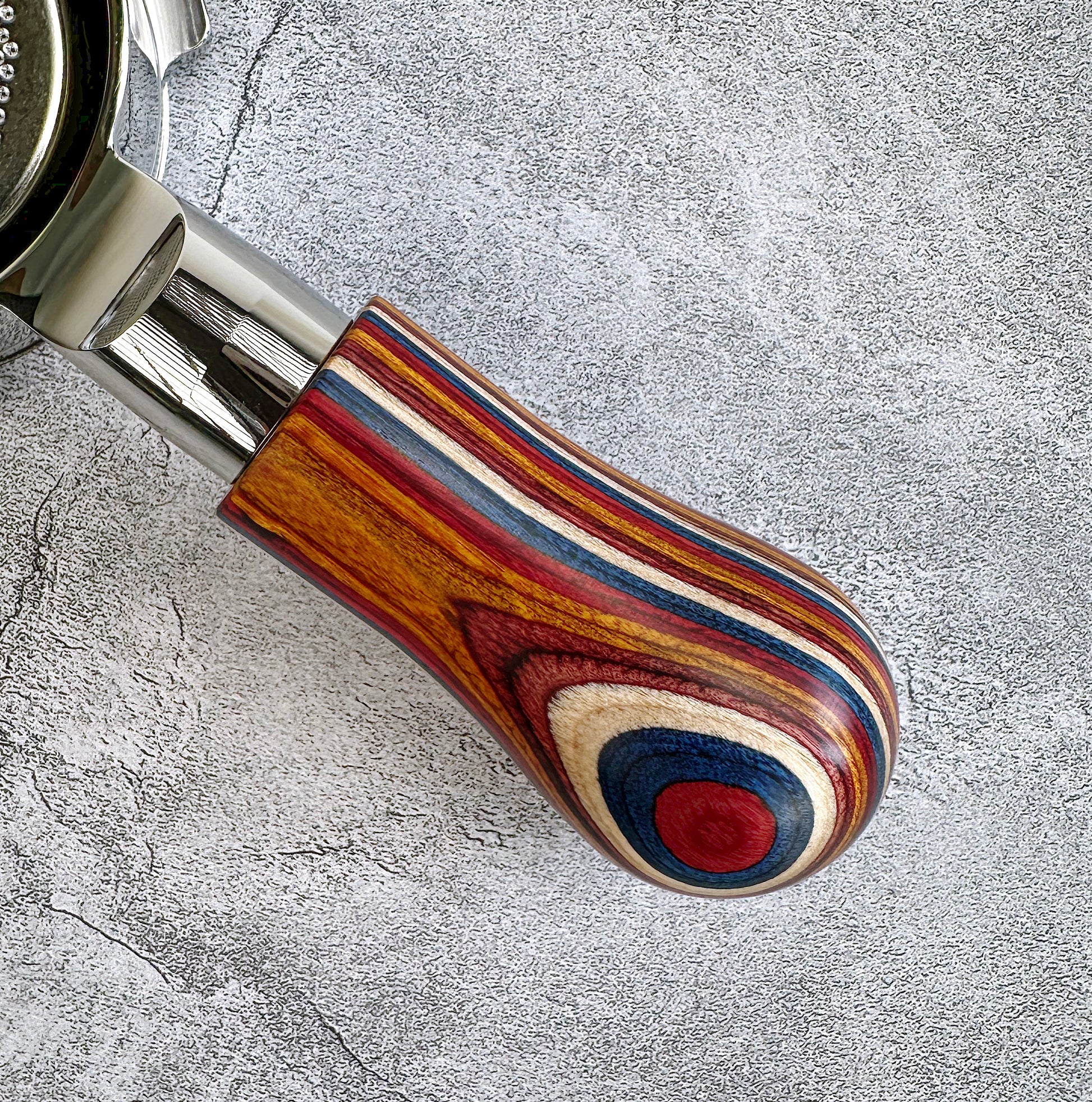 This 54mm bottomless portafilter features a short handle crafted from vacuum-dyed timber in a striking red hue. The vacuum dyeing process ensures the dye penetrates deep into the wood fibers, creating a more consistent and long-lasting color compared to traditional staining methods. This process is also environmentally friendly, as it uses less water and dye.
