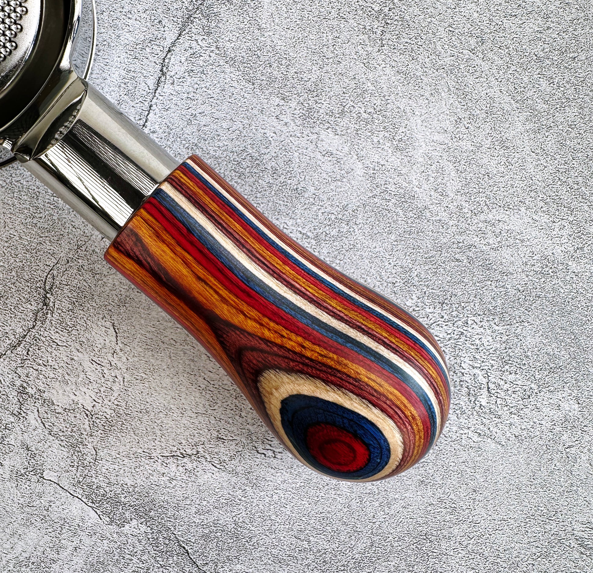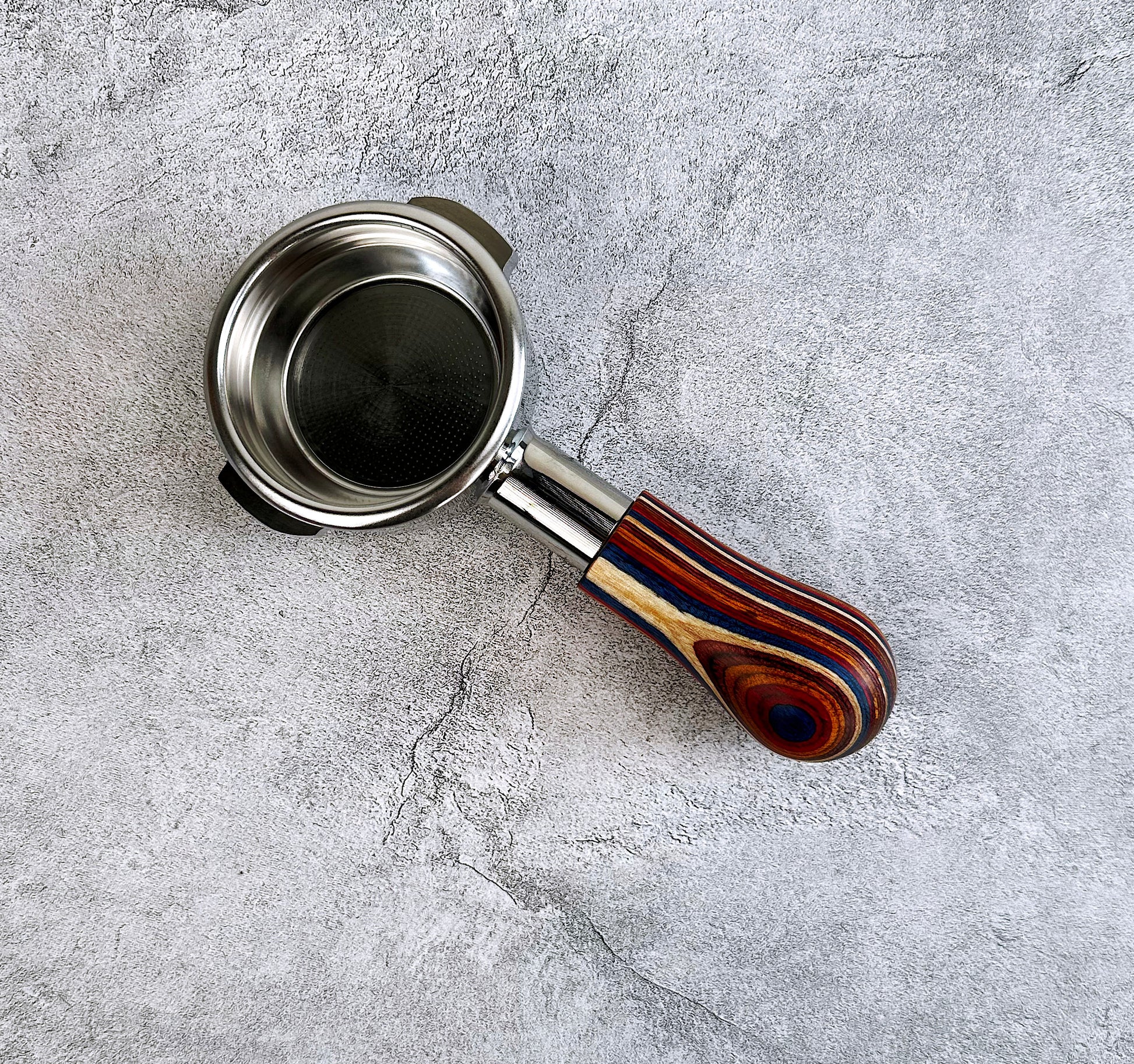 This 58mm bottomless portafilter features a short handle crafted from vacuum-dyed timber in a striking red hue. The vacuum dyeing process ensures the dye penetrates deep into the wood fibers, creating a more consistent and long-lasting color compared to traditional staining methods. This process is also environmentally friendly, as it uses less water and dye.