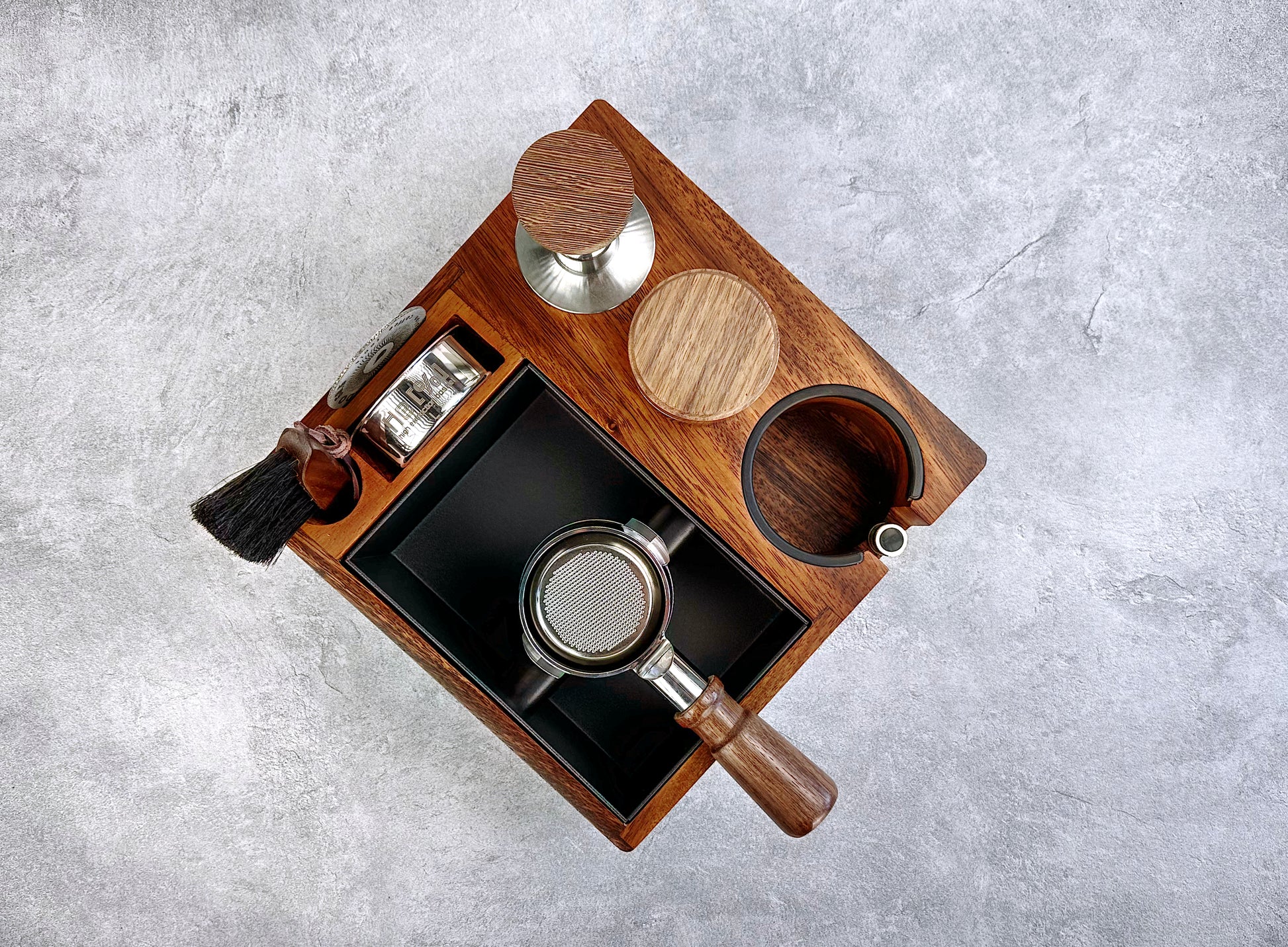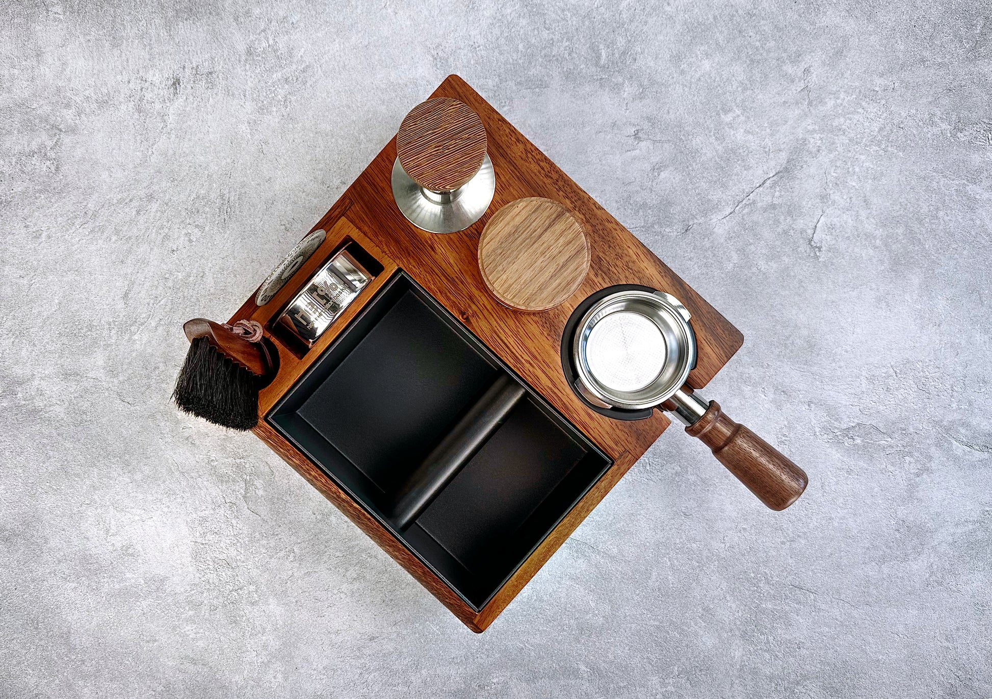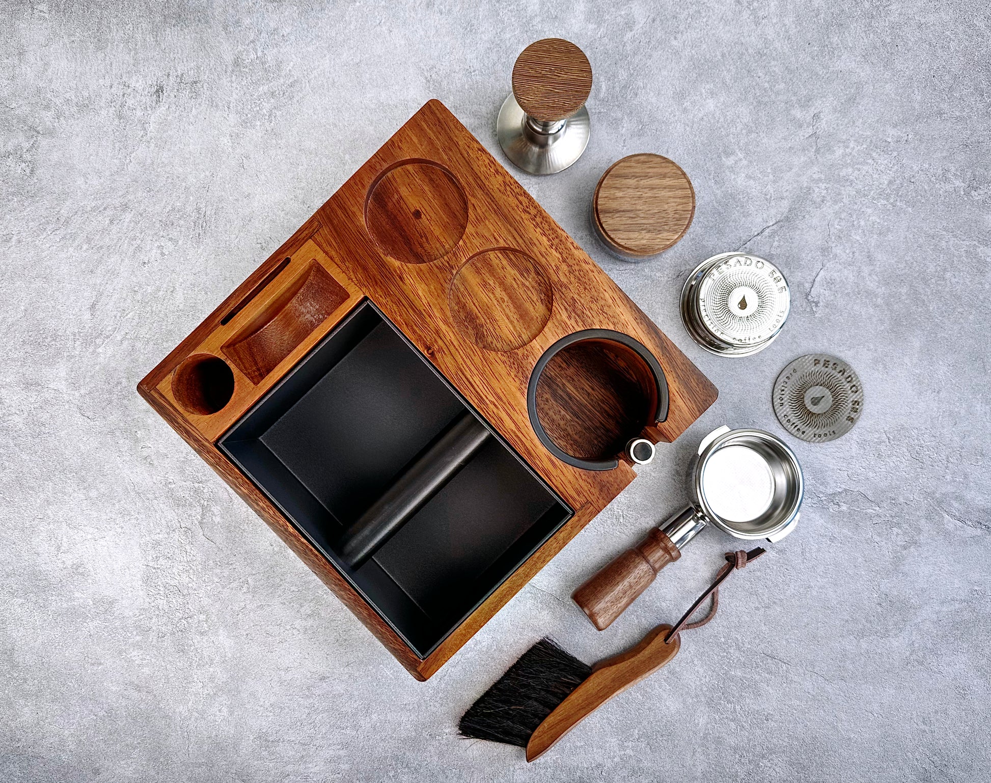 - Five slots for storage: tamper, distribution tool, portafilter basket, puck diffuser, and brush or accessories.
