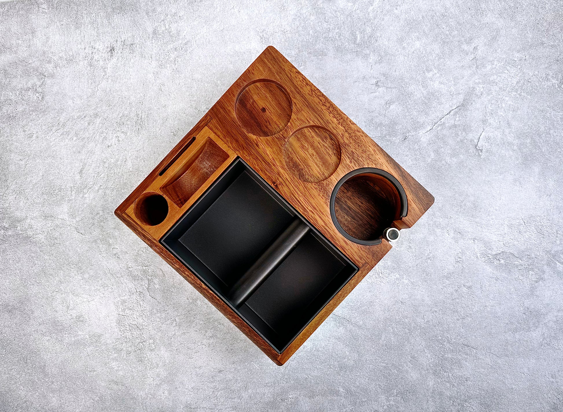 Introducing the Coffee Espresso Walnut Wood Tamping Station with Knock Box V5, the lighter version of our popular tamping station with a built-in knock box that fits most popular sizes of coffee accessories (e.g., 51mm, 53mm, 54mm, and 58mm portafilters).