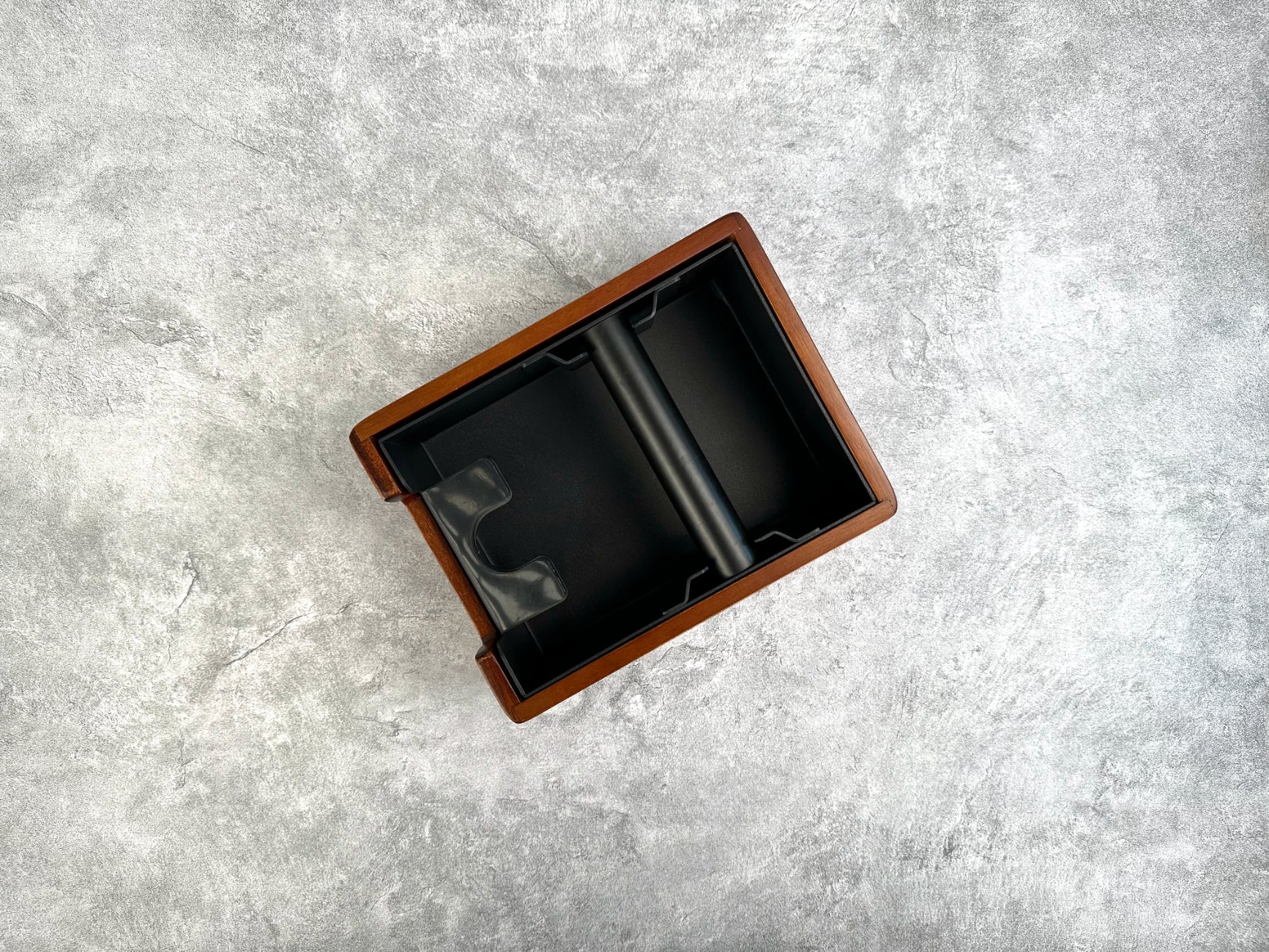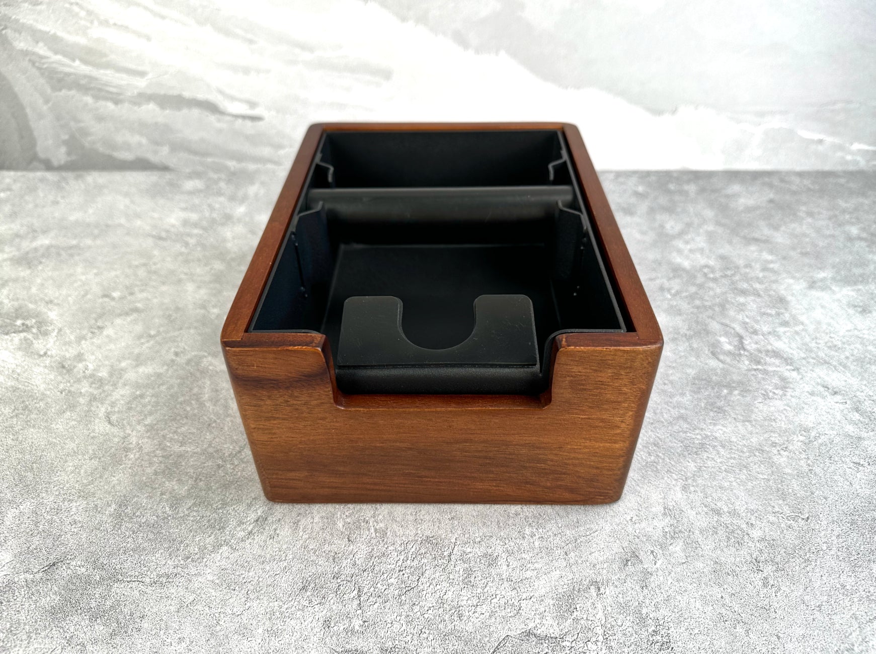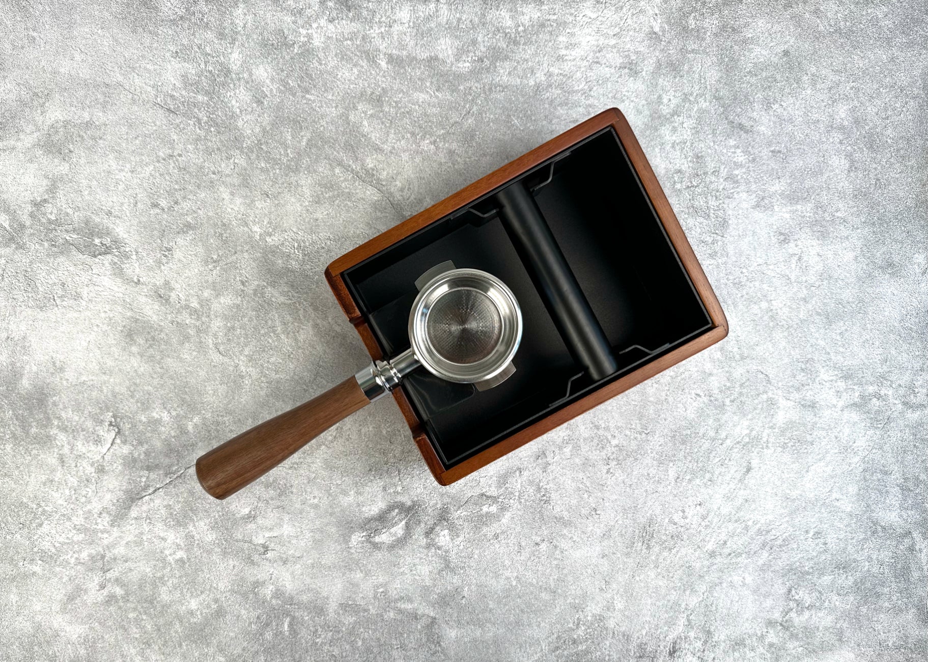 Crafted from luxurious walnut wood, this tamping station is a stylish addition to any coffee setup. The portafilter stand at the front allows for easy distribution and tamping of coffee grounds, while the rear features a rubber bar to knock out that pesky coffee waste.