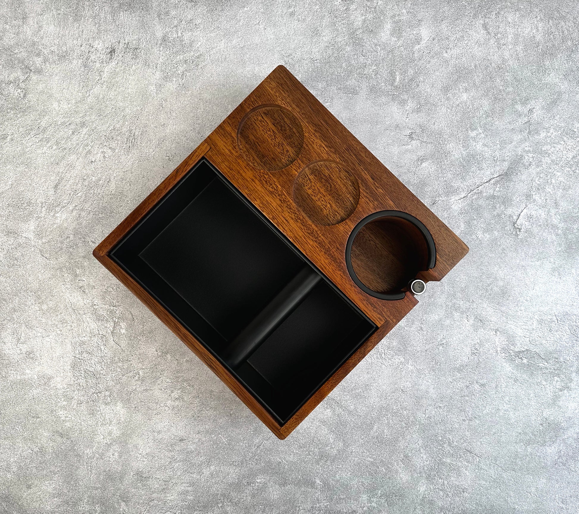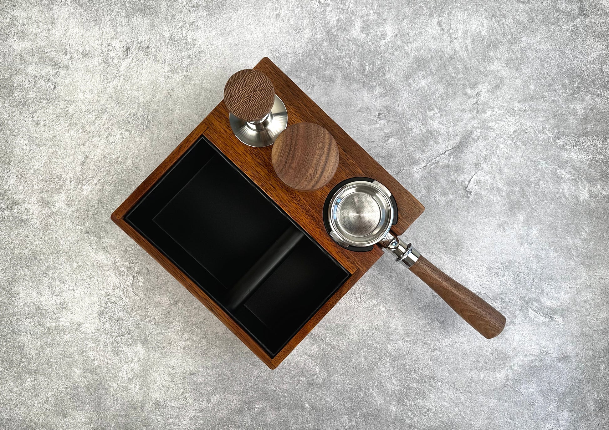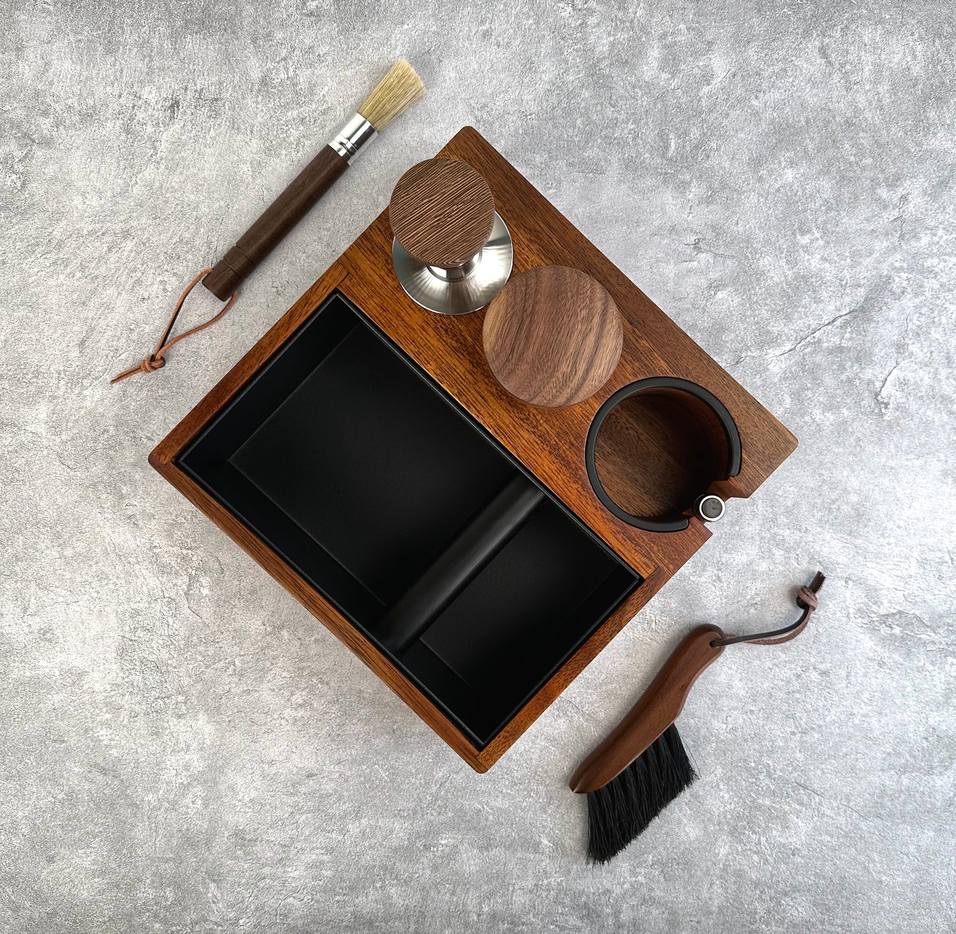 Introducing the Coffee Espresso Walnut Wood Tamping Station with Knock Box V4, the lighter version of our popular tamping station with a built-in knock box fits most popular size of coffee accessories(eg., 51mm, 53mm, 54mm and 58mm portafilter).