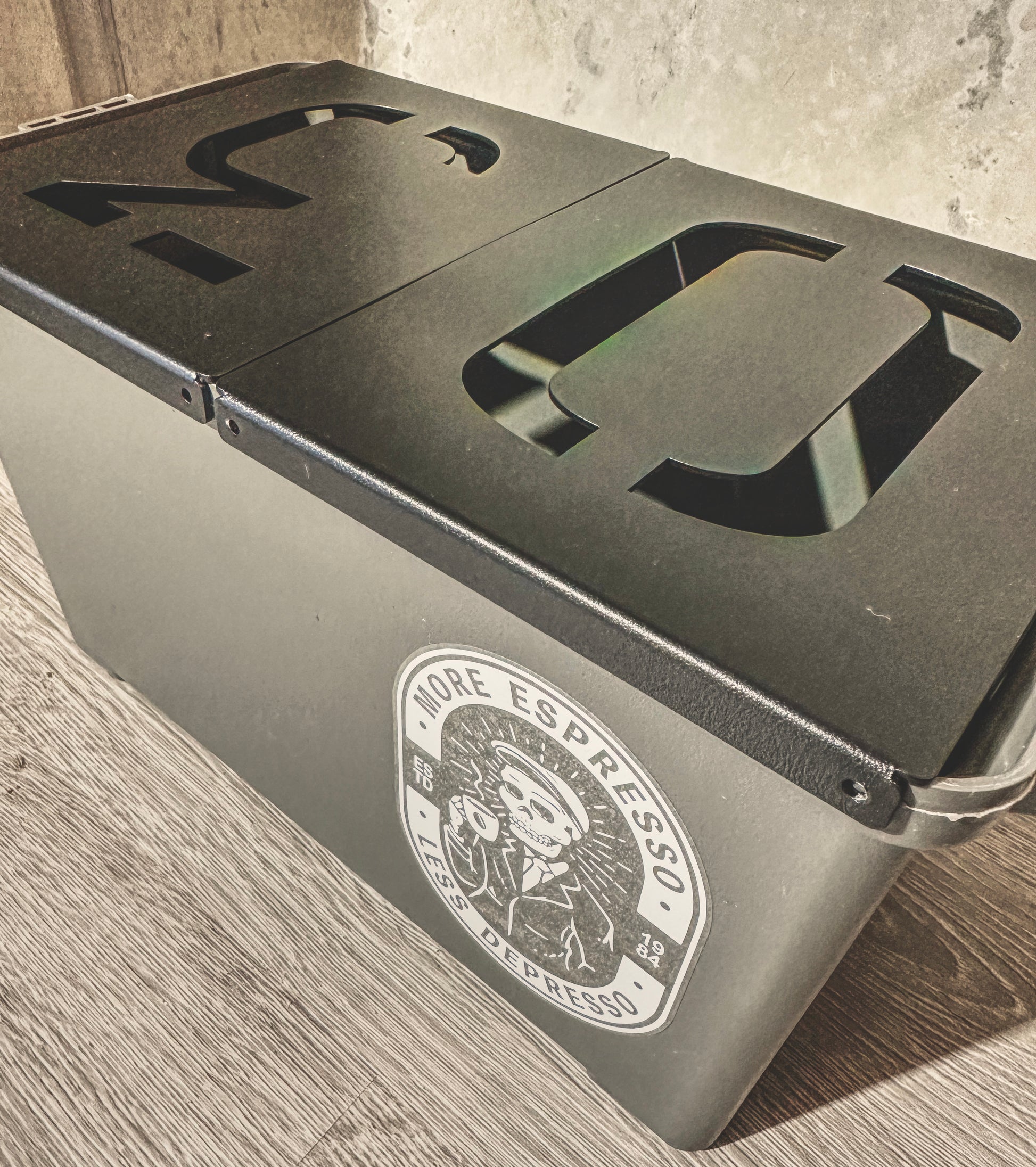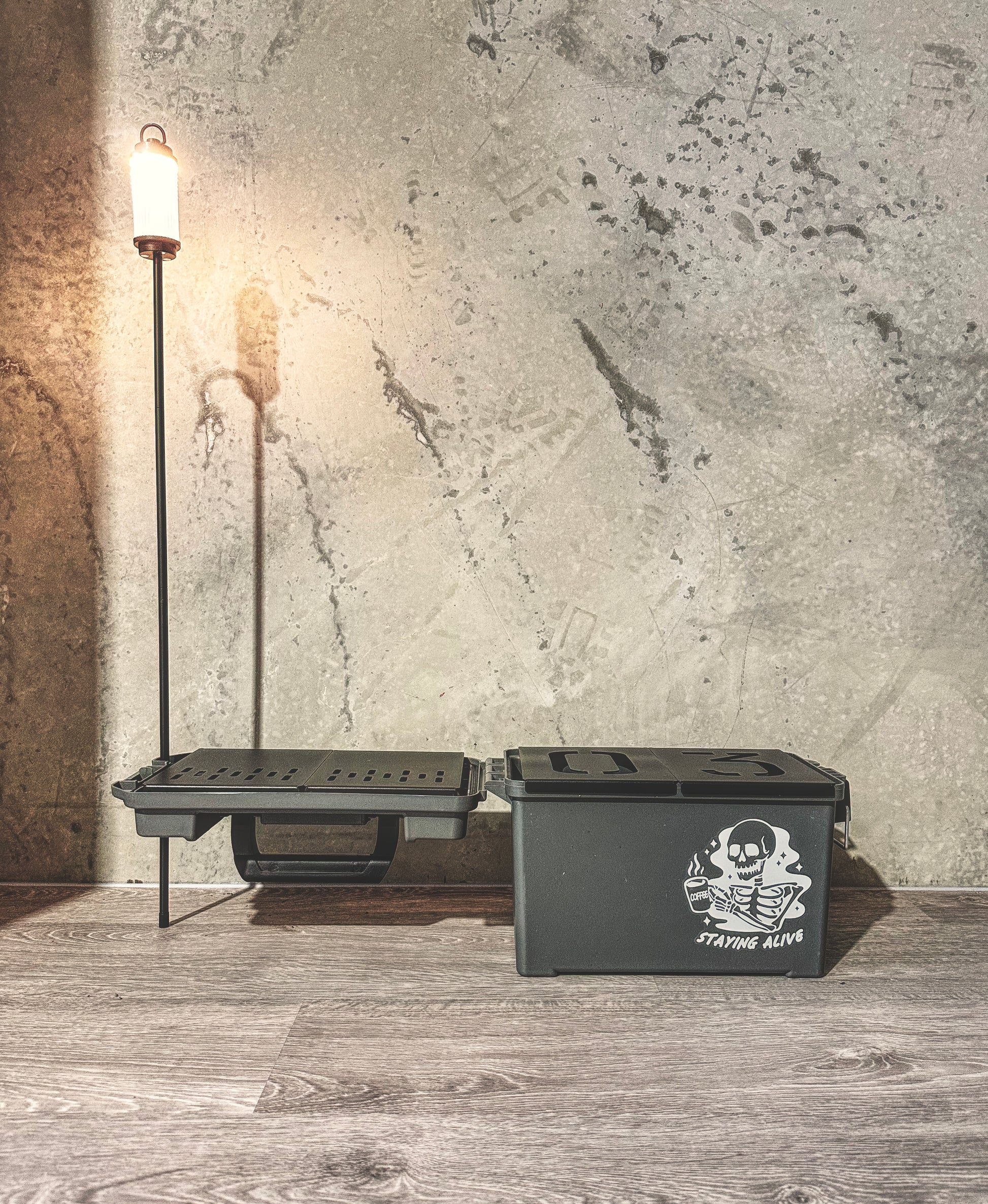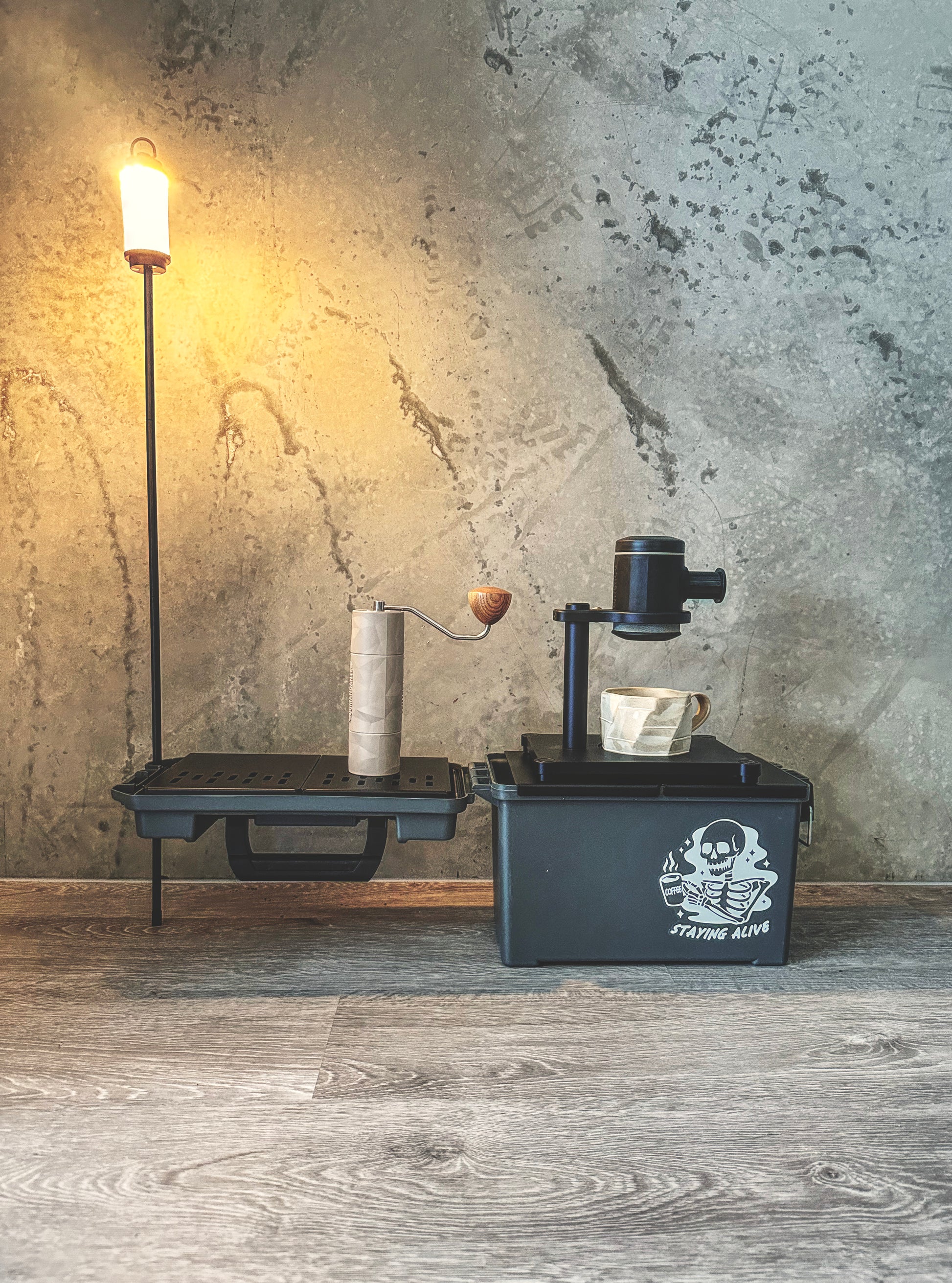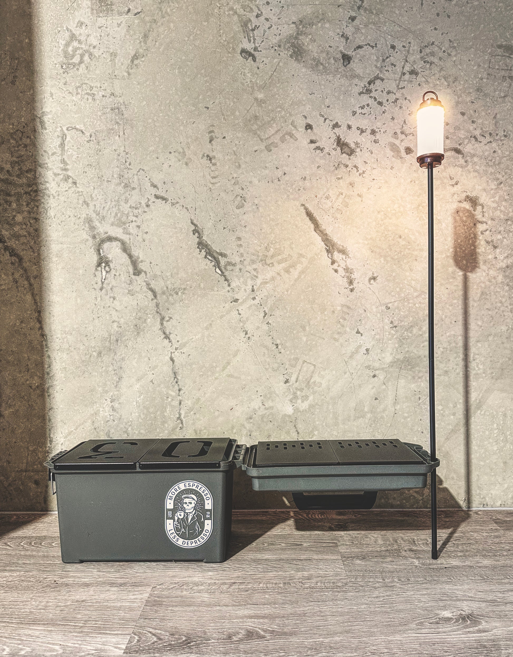 - 1 x Compact Camping Coffee Storage Box with Built-in Foldable Table (plain dark army green colour without the coffee skull decal stickers)