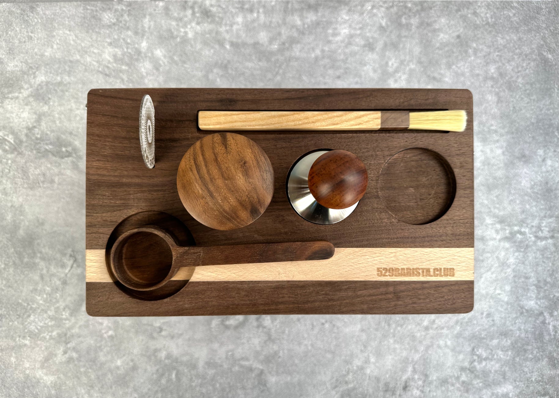 The top tier features 6 zones to keep all your coffee accessories organized and at arm's reach. No more fumbling around searching for your tamper or distribution tool - they're right where you need them. And with a removable silicon dripping mat on the bottom tier, you can keep your cups and portafilter clean and tidy, even when you're away from home.