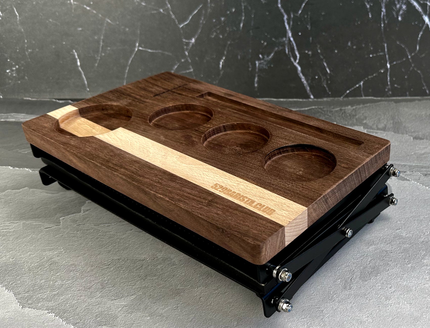 The top tier features 6 zones to keep all your coffee accessories organized and at arm's reach. No more fumbling around searching for your tamper or distribution tool - they're right where you need them. And with a removable silicon dripping mat on the bottom tier, you can keep your cups and portafilter clean and tidy, even when you're away from home.