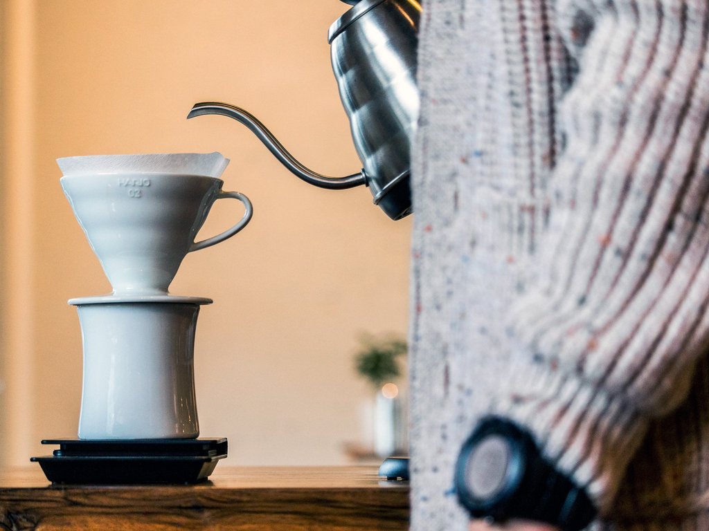 - Place the ground coffee in the now wet filter paper then start pouring slowly onto the ground coffee.