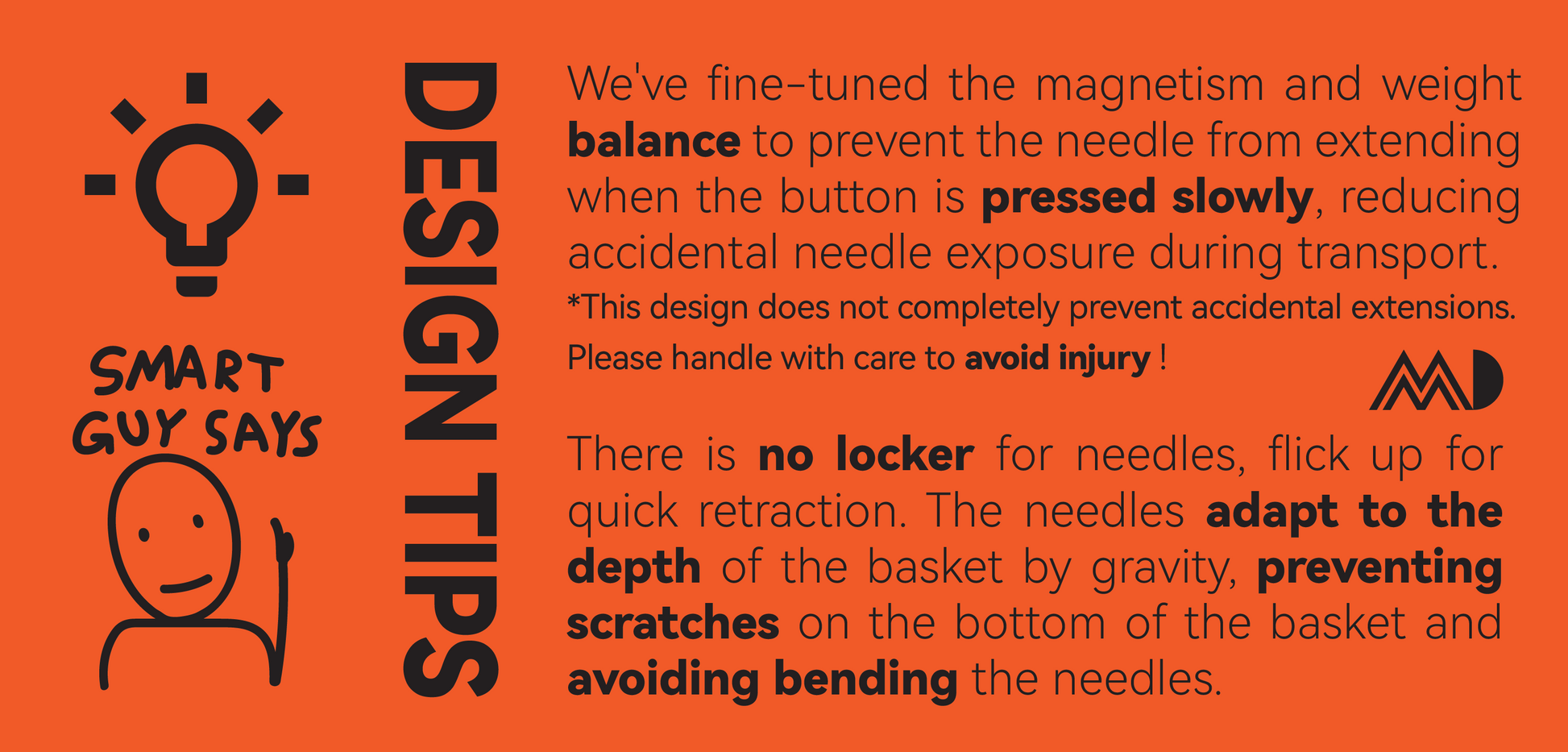 Say goodbye to the frustrations of traditional distribution tools. With the Madpen, retractable needles ensure seamless operation with a simple click and flick motion. Needles effortlessly extend when needed, and with a quick flick of the wrist, they retract back into the tool, eliminating the risk of bending or snagging.