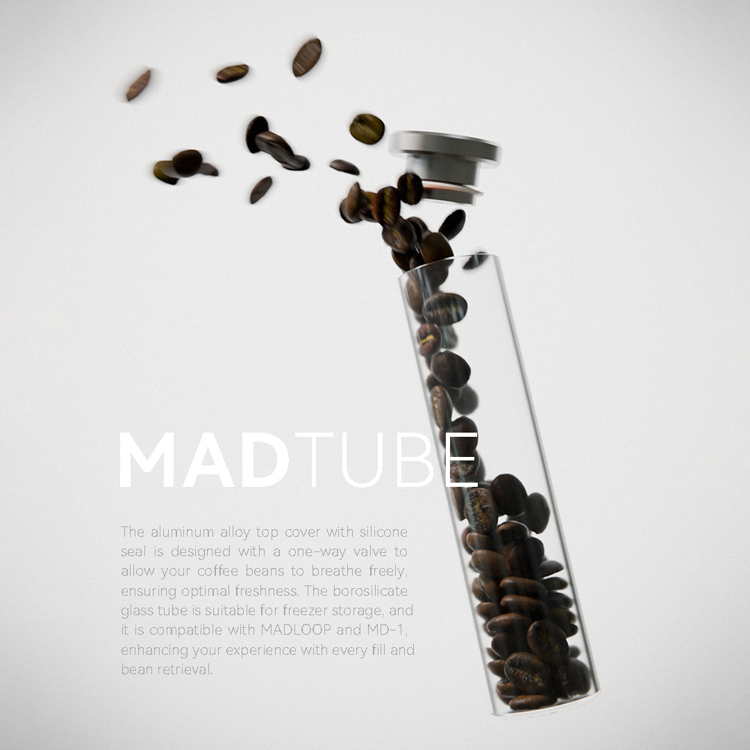 Each tube is made from food-safe, freezer-safe borosilicate glass and features an aluminum alloy top cover with a silicone seal and a one-way valve. The valve allows CO₂ to escape from the coffee beans while preventing external air from entering, helping rid your beans of oxygen that can cause oxidation and staleness. This ensures optimal freshness, resulting in better-tasting coffee. Designed for freezer storage, MADTube is compatible with the MADLoop and MD-1 systems, enhancing your coffee experience with every fill and retrieval.