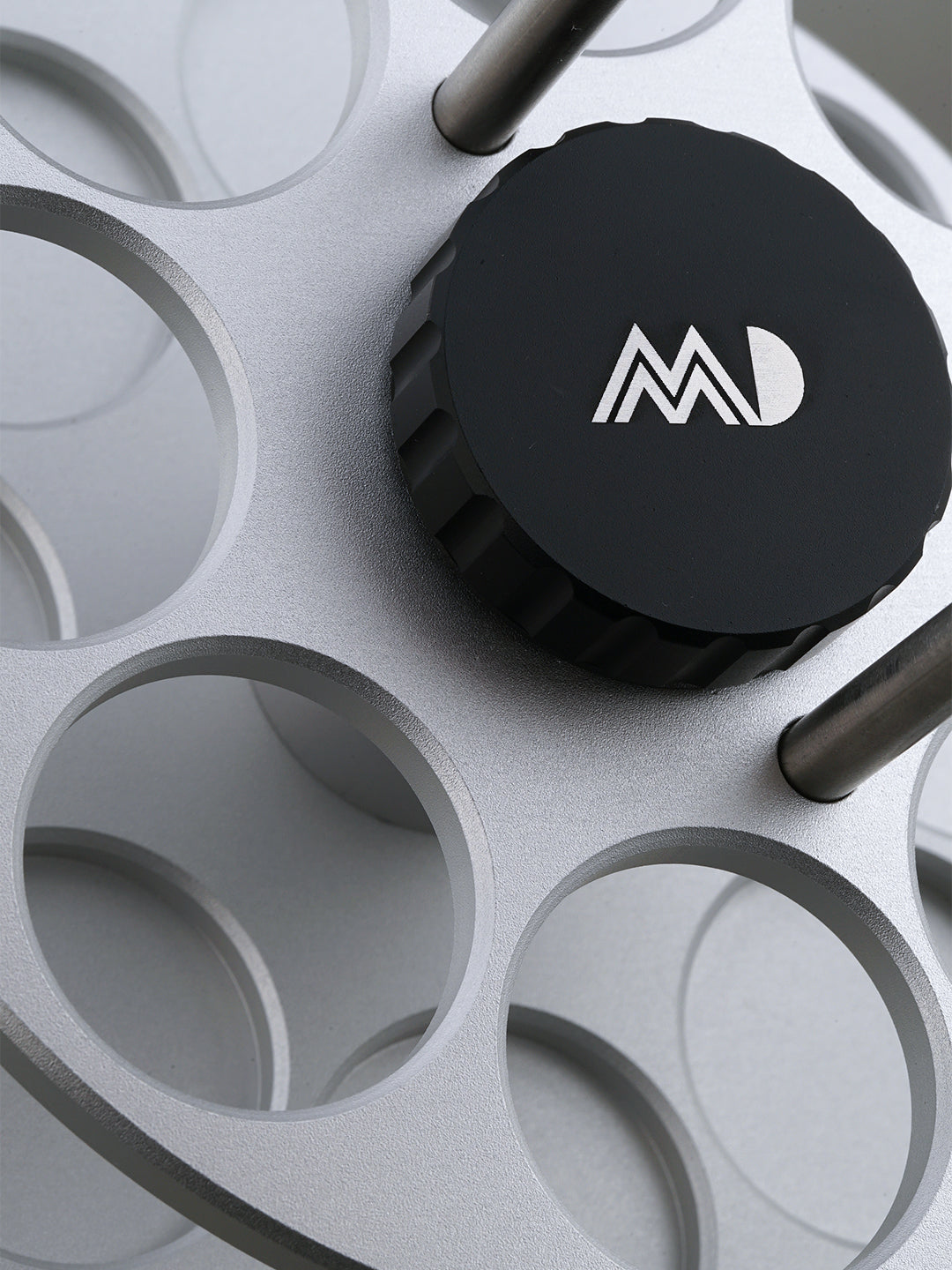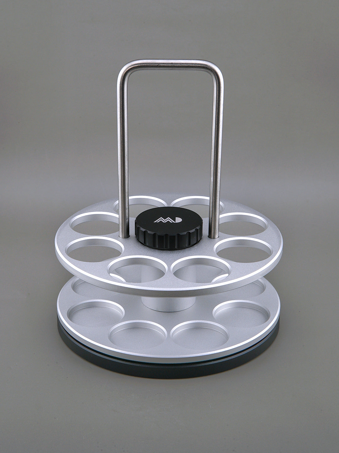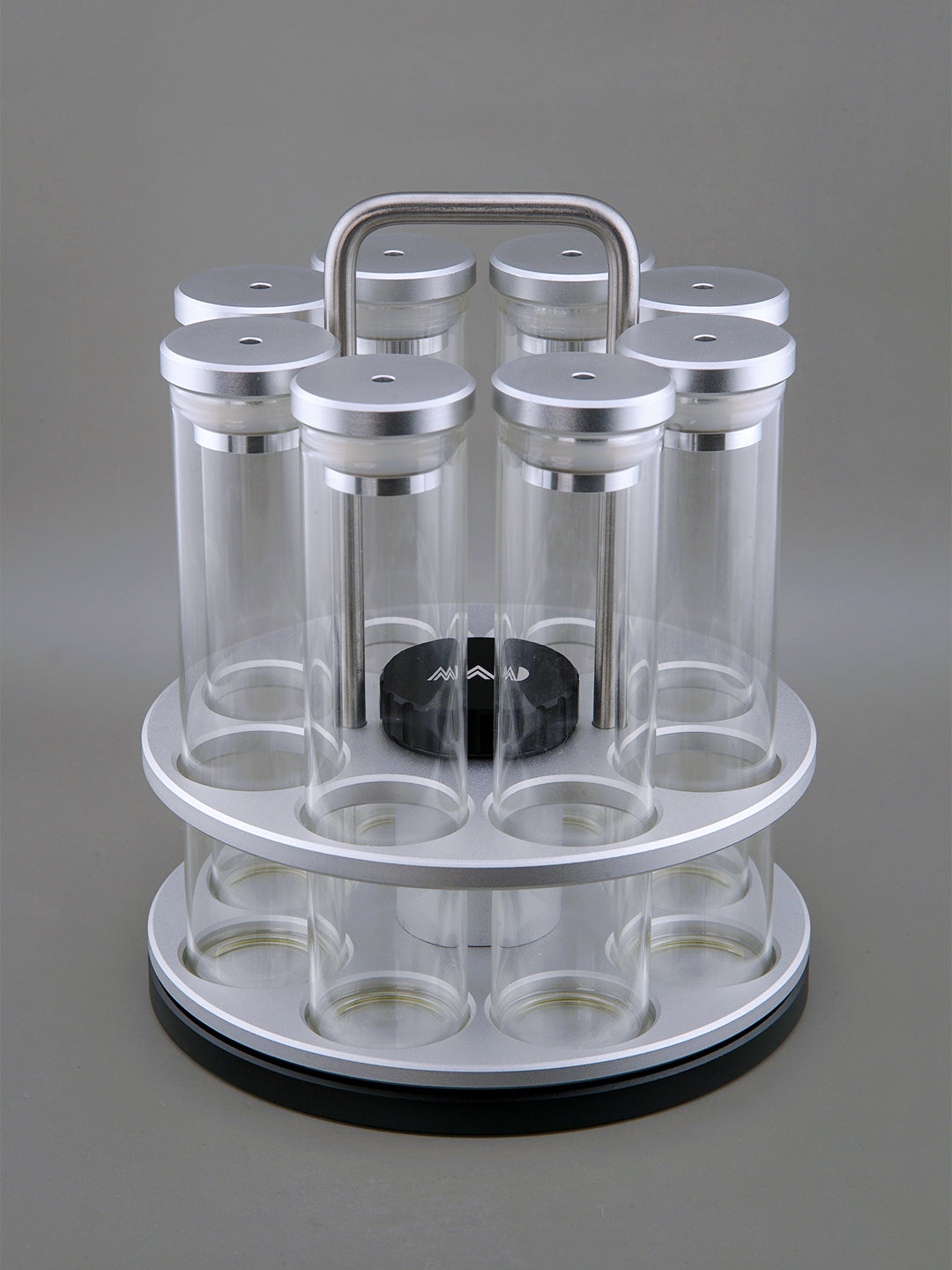Crafted from CNC Aluminum Alloy with a stainless steel handle, this sleek and durable rack holds up to 8 MADTube Coffee Bean Storage Tubes. Equipped with dual bearings, it enables smooth, infinite rotation, making coffee bean retrieval effortless while offering a stress-relieving spinning action.