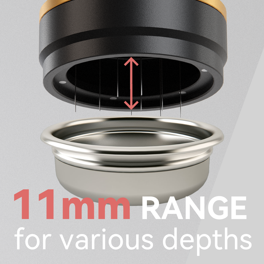 Additionally, the tool features an adjustable needle length, effortlessly customizable to fit virtually any 53mm and 54mm portafilter basket. Simply rotate the adjustment ring to achieve a tailored fit for your preferred portafilter basket. Elevate your espresso game with the precision and innovation of the MADBALL Dyna WDT Tool.