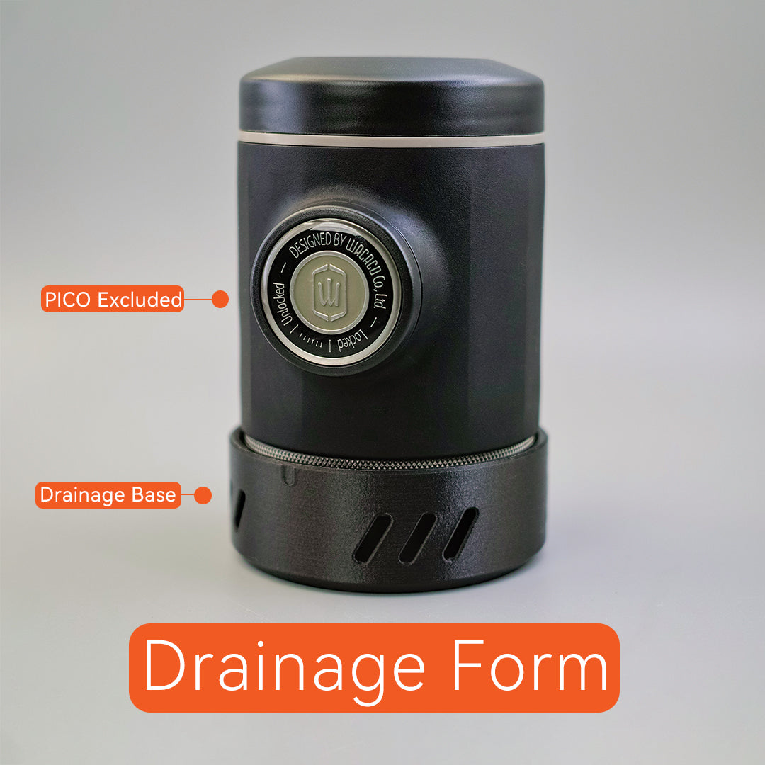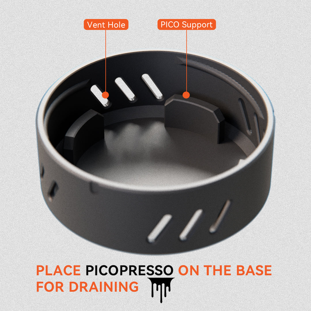 Additionally, the Picopresso's base serves a dual purpose as a drainage base, ingeniously designed to facilitate the drying process. Simply rest your Picopresso on top of the base after use, and let gravity do the work as any residual moisture drains away. This thoughtful feature not only helps maintain the integrity of your Picopresso but also ensures that it's always primed and ready for your next espresso-making session.