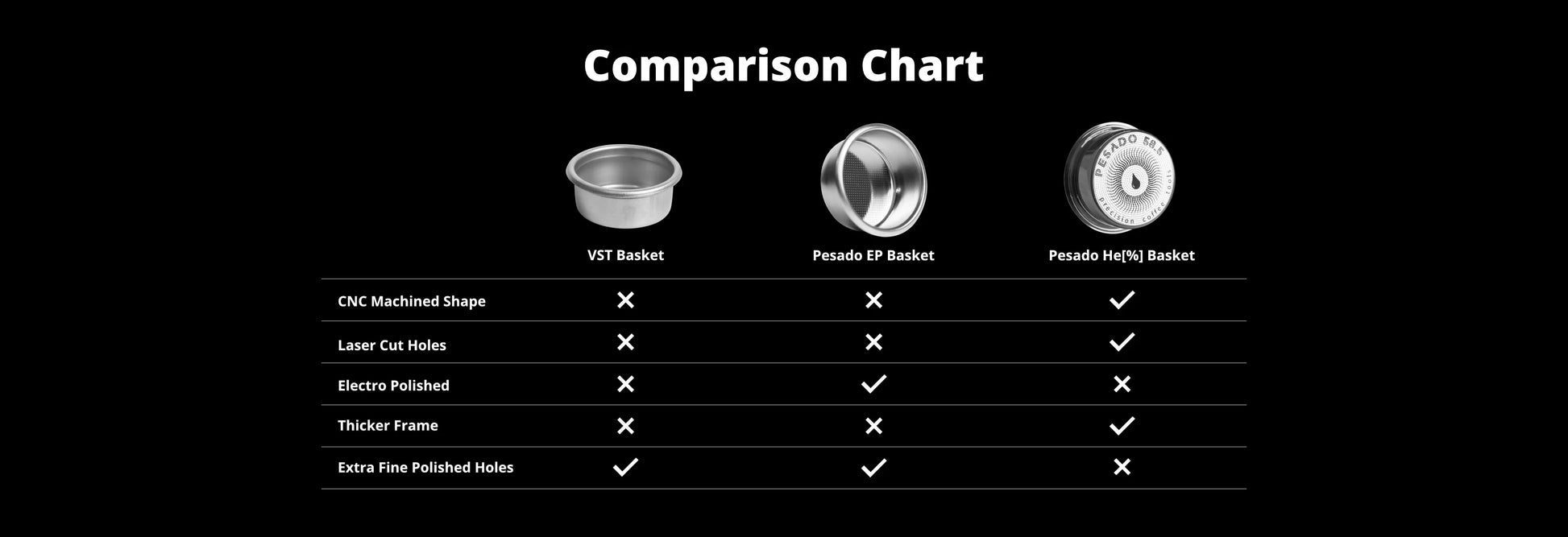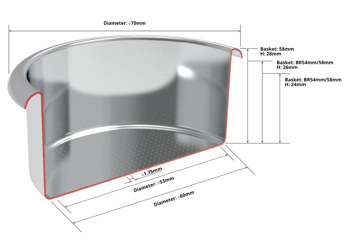 These are electro polished to increase the smoothness in all surfaces, including inside the holes to increase the forgiveness of use. The EP filter basket offers dosing capacities within ±1g of the recommended size.