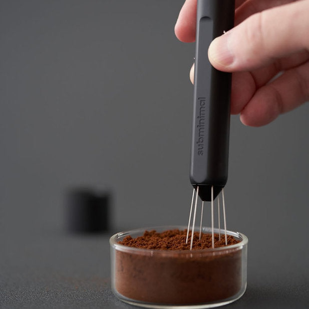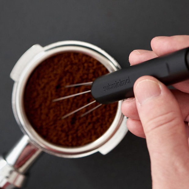 The Flick espresso distribution tool (WDT) is intuitive, fun to use, and safe, thanks to its retractable needles. One click pops the needles out when you need them, and a flick of the wrist sends them right back in.