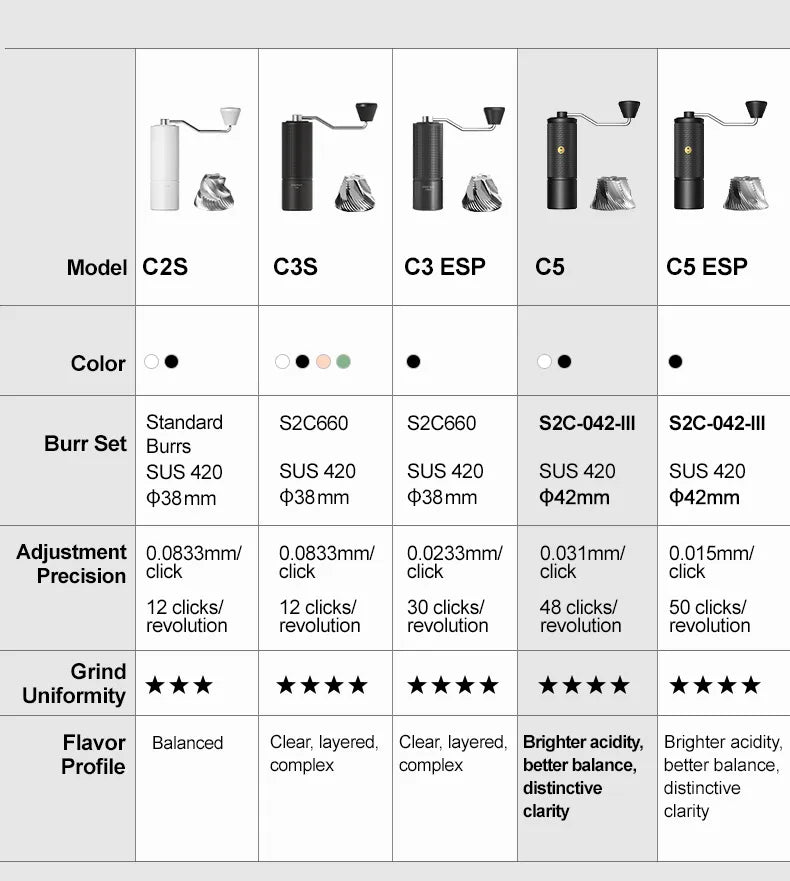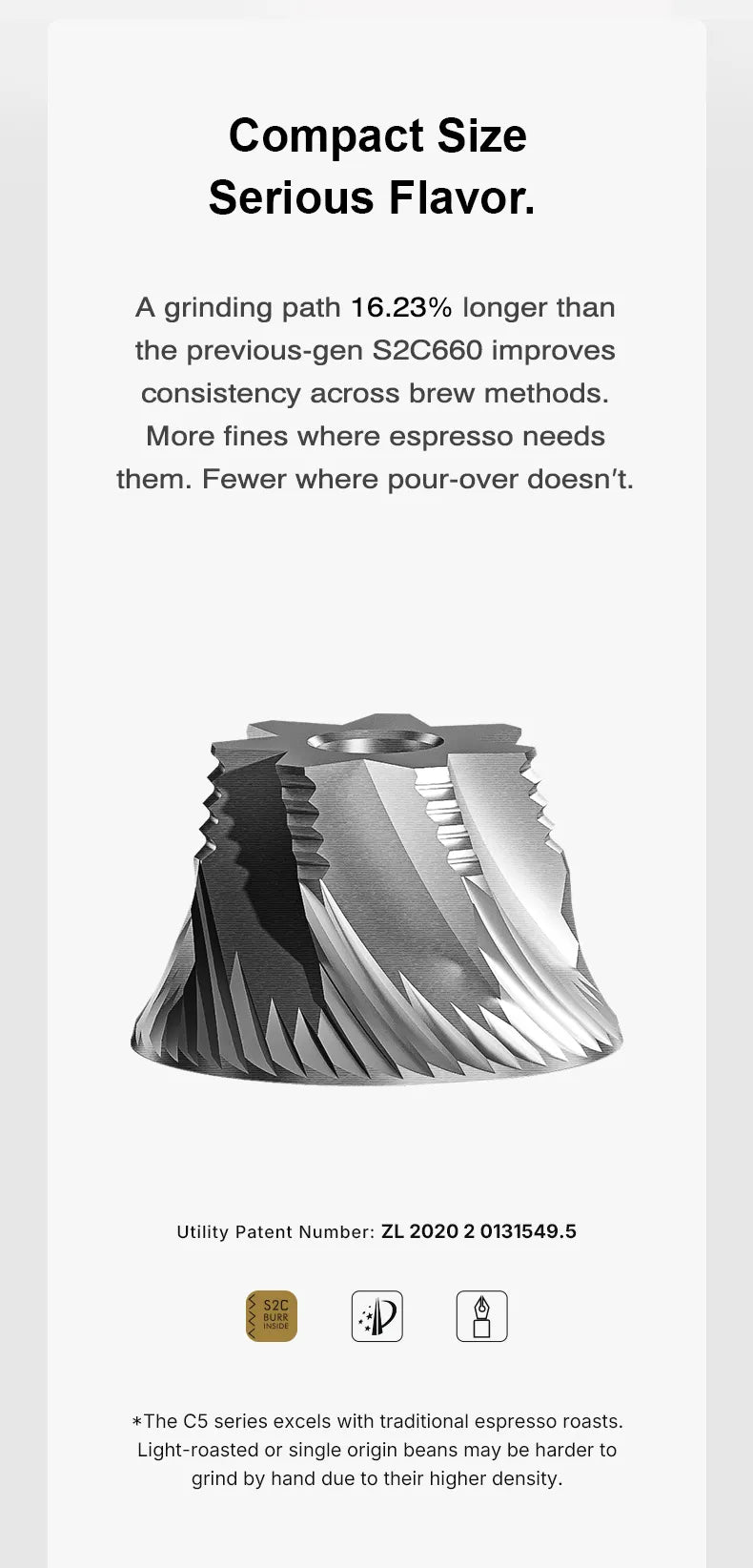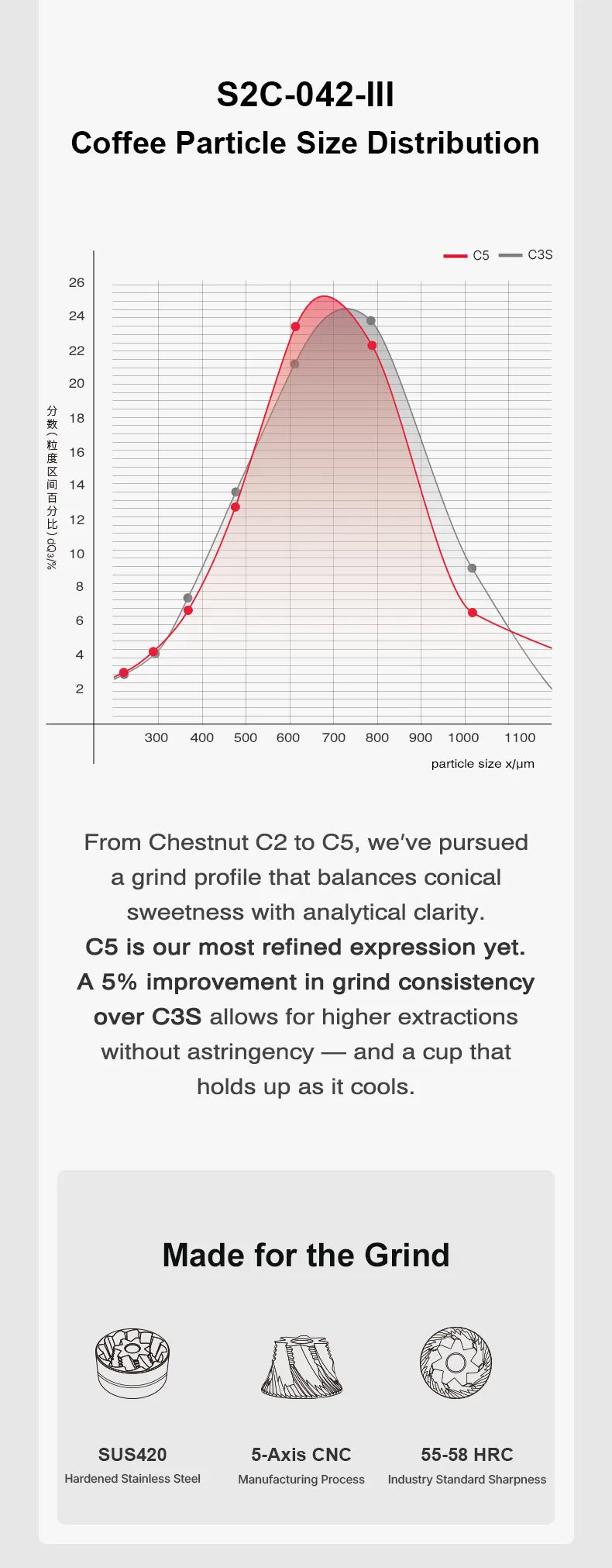 The Chestnut C5 represents a clear evolution from Timemore’s popular C3 grinder, enhancing both performance and precision. The most significant upgrade lies in the burr set: the C5 features 42 mm S2C-042-III burrs, larger and more refined than the 38 mm S2C burrs in the C3. This results in greater grinding efficiency, reduced wobble, and improved consistency — producing a cleaner, more balanced flavour profile, especially noticeable with lighter roasts and espresso brewing.