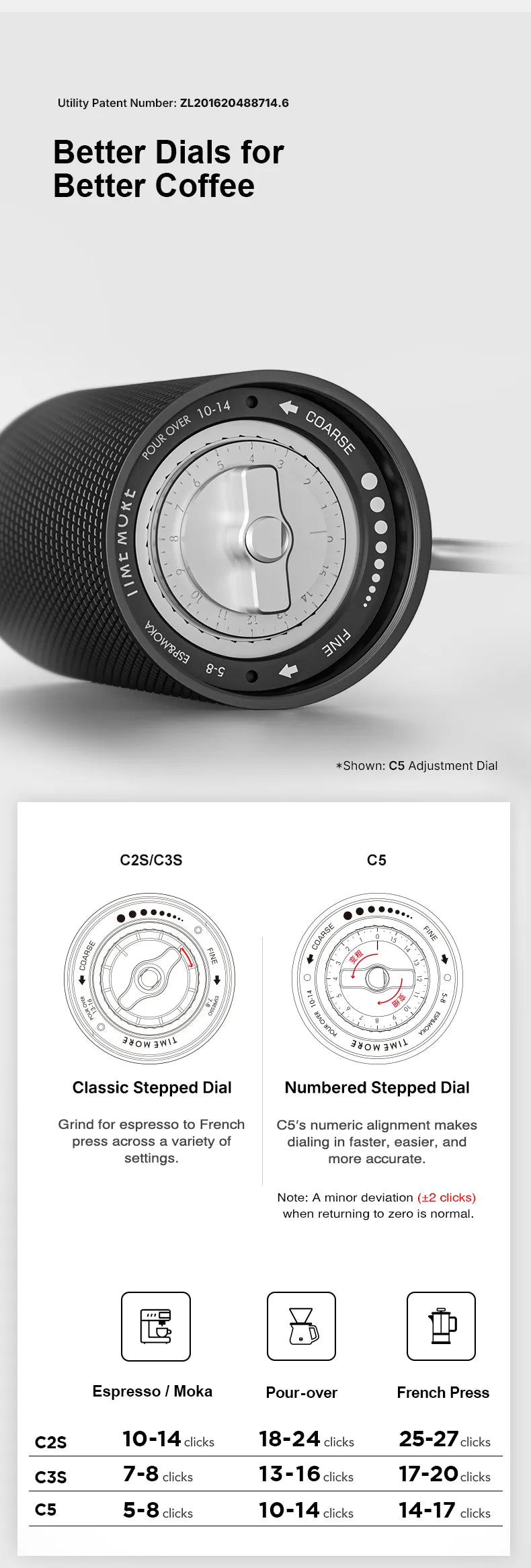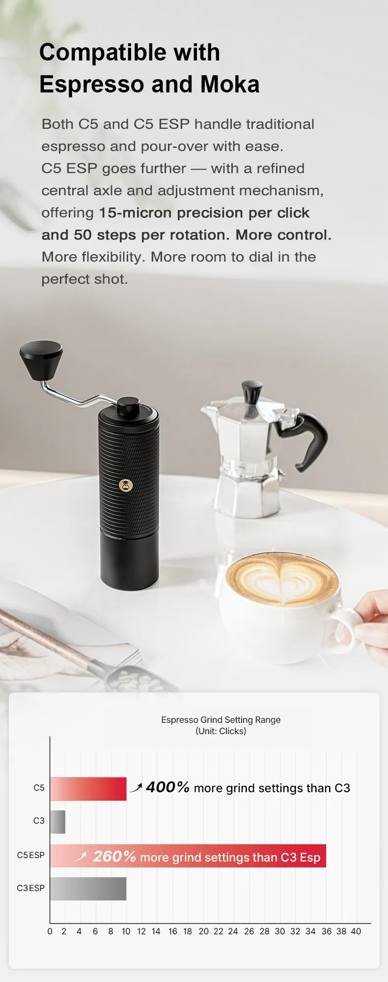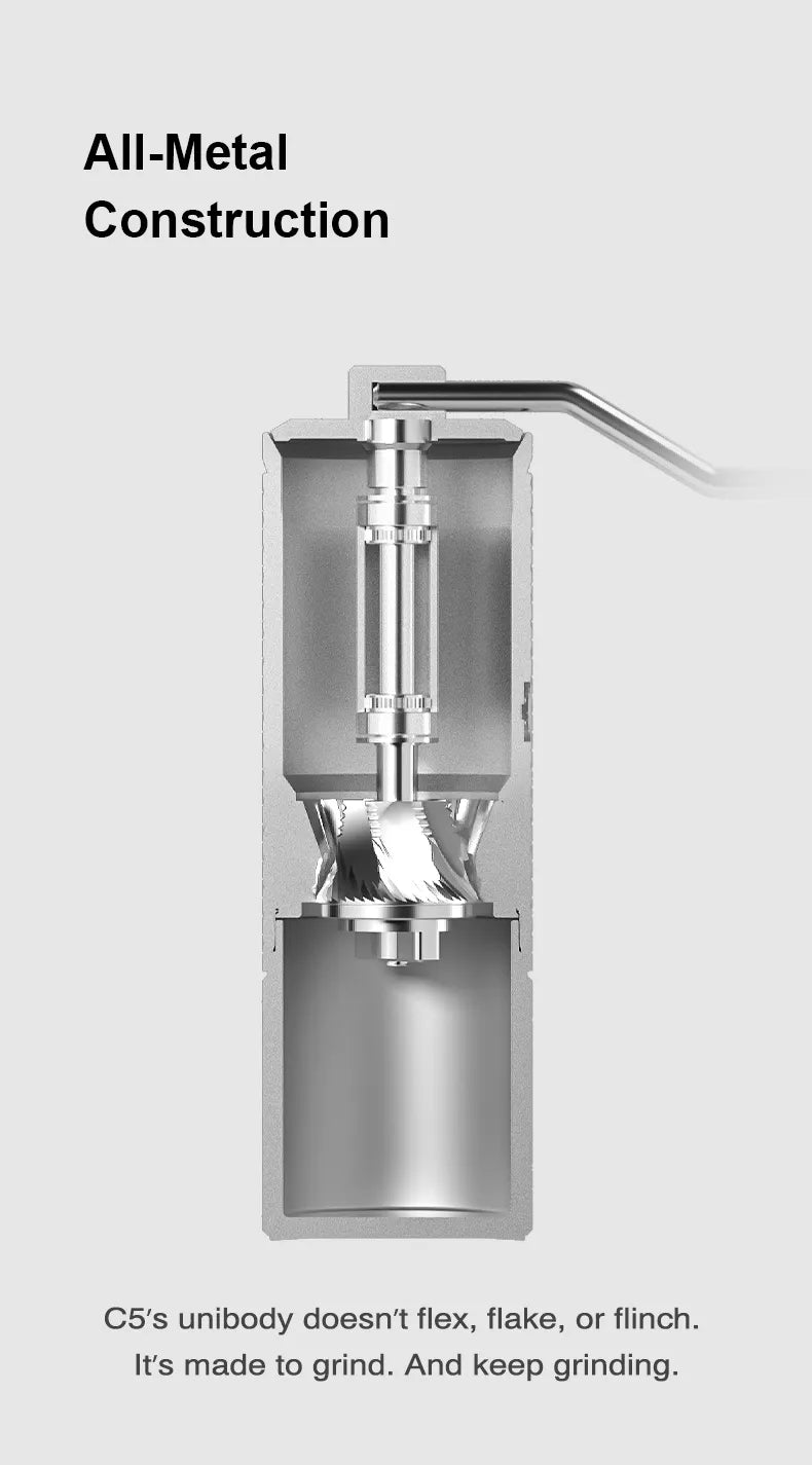 While the C3 offers reliable stepped adjustment suitable for filter coffee, the C5 refines this mechanism to allow finer, more precise control over grind size. This makes it more versatile across brewing methods, from coarse grinds for French press to fine grinds for espresso. It’s particularly beneficial for users who want better repeatability and consistency between brews.