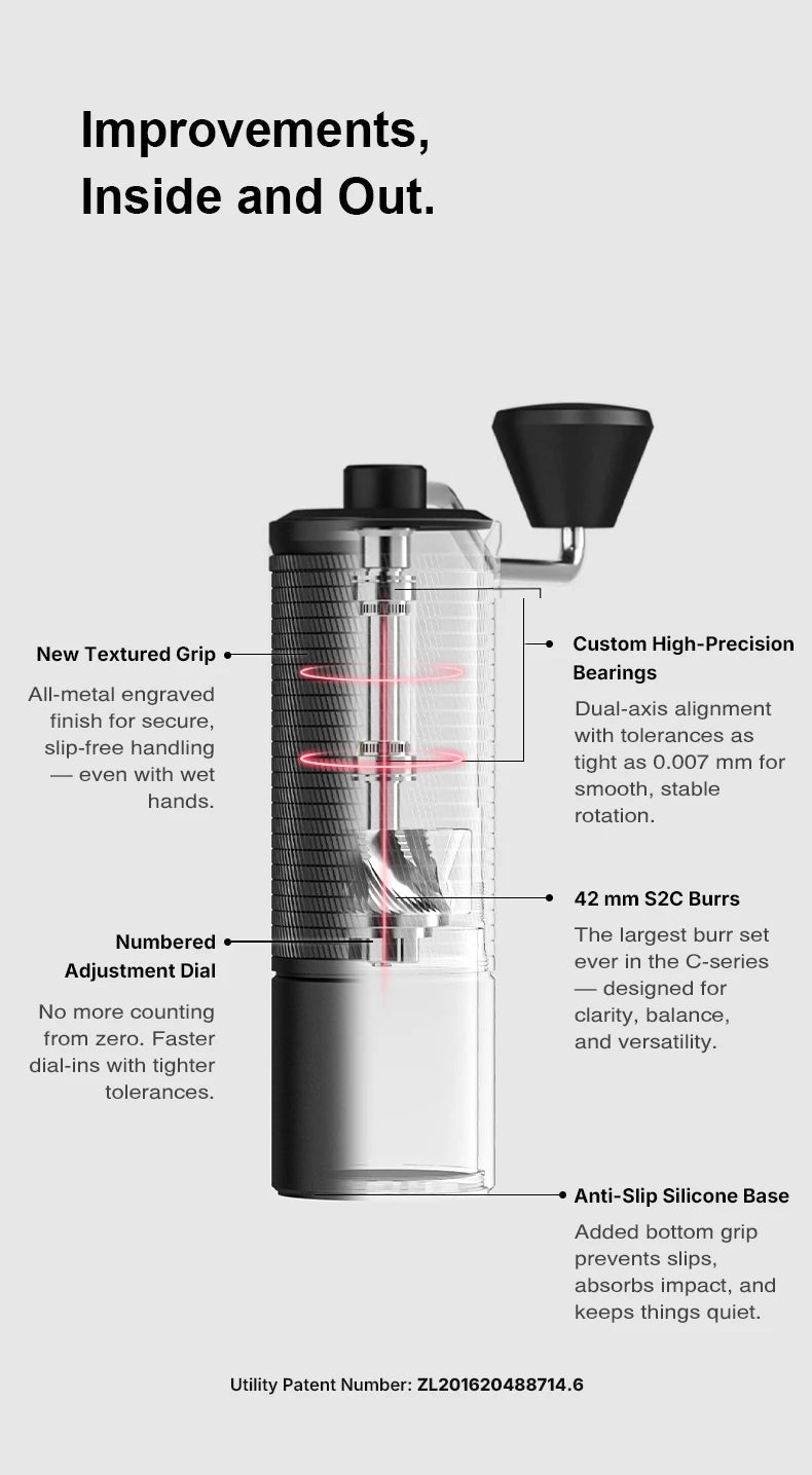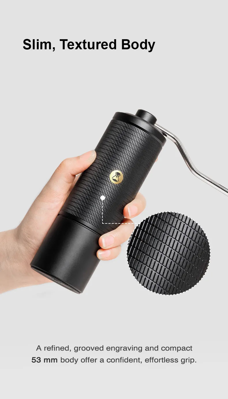 The solid aluminium body provides excellent stability and a premium feel, while the textured grip and anti-slip silicone base ensure comfortable, steady grinding. With its improved burr design and fine-tuned adjustment system, the Chestnut C5 offers outstanding grind uniformity and clarity — ideal for coffee lovers who demand precision and quality in every cup.