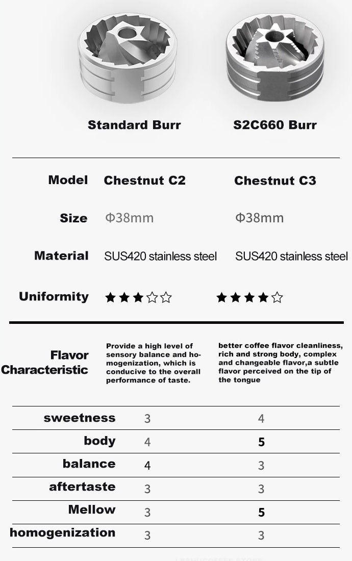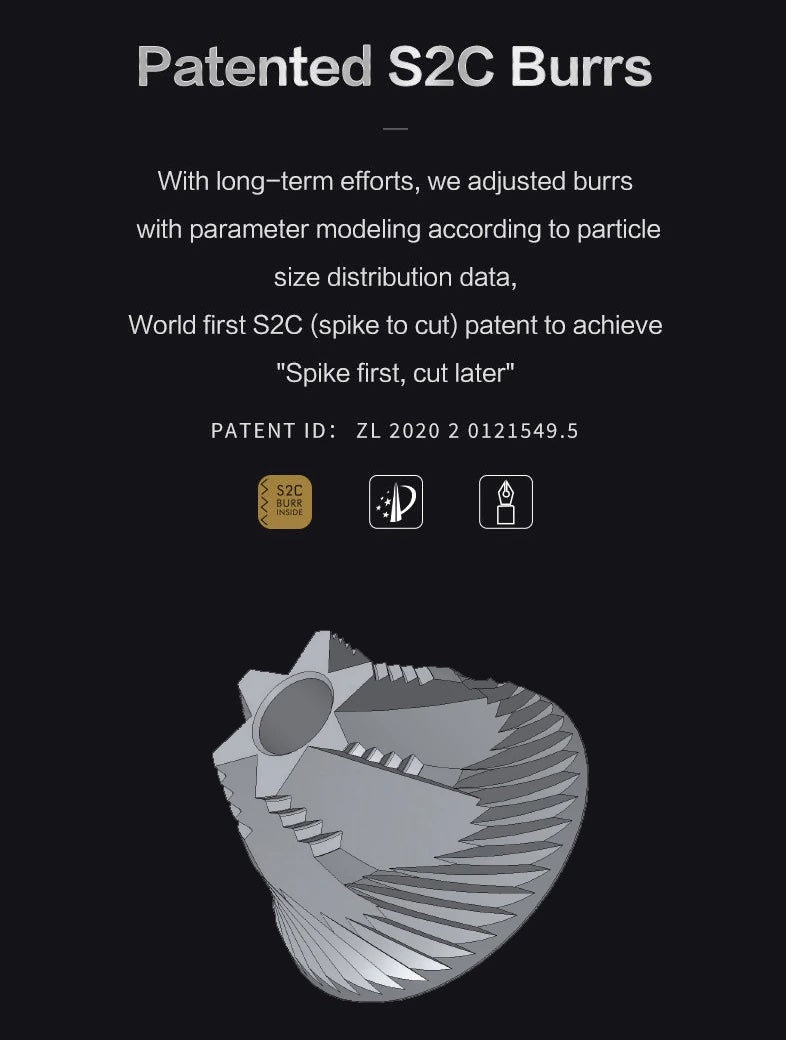 The S2C660 burr is derived from the S2C860 on the original chestnut X model. After the chestnut X model was launched, it has won unanimous praise in the industry. Based on the original burr, the design team reduced the size and fine-tuned the parameters, and the overall grinding effect was significantly improved.