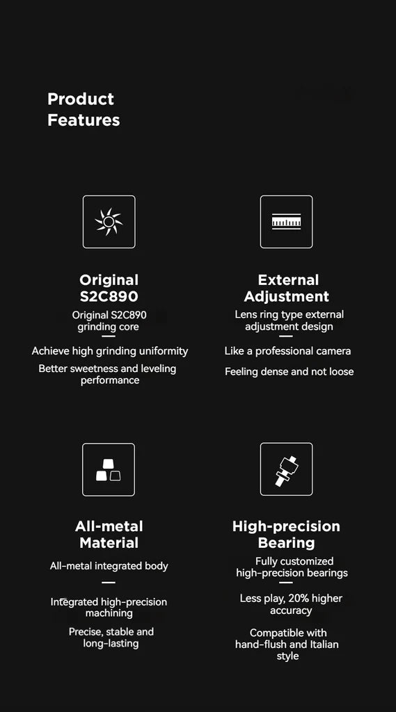 External Click Adjustment - Fine tune your grind settings down to 0.015mm steps, with the scales labelled so you no longer have to manually count from zero (like with the C3 series).