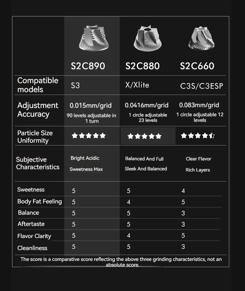 New Patented 42mm S2C890 Burr - The upgraded Spike-2-Cut (S2C) 890 burr set reduces fines and improves grind distribution and consistency.